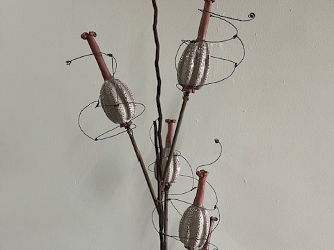Deborah Stewart’s Propagation and Endurance highlights the strength in fragility through clay and metal seed pod ceramic sculptures. Seed pods are the protective casing on flowers and plants that keep seeds safe until they are ready to spread. This structure allows delicate flora to propagate, endure, and continue into the future—despite intense environmental, climate, and other outside forces. Robust clay seed pods are complemented by minimal steel and wire structural forms, blurring the line between what appears fragile and what appears formidable. By pairing the vulnerability of clay with the rigid strength of metal, Stewart encourages respect and acknowledgement of the enduring power of fragile things.