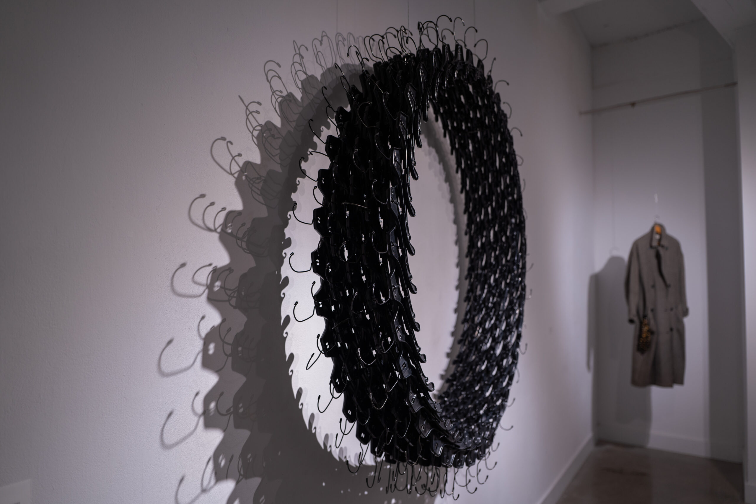 Originally conceived as a reimagining of studio materials collected over the past twenty years, the direction of “Everything Stays” shifted dramatically following a personal loss. While preparing for the exhibition, Bajus’s father, a highly skilled and respected tailor in Slovakia, passed away. His father’s craftsmanship had profoundly influenced Bajus’s artistic journey, and after his passing, the artist spent time in his father’s workshop surrounded by the tools and remnants of a life dedicated to making.