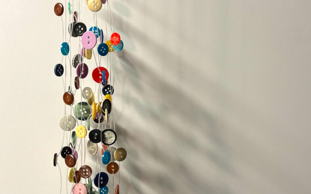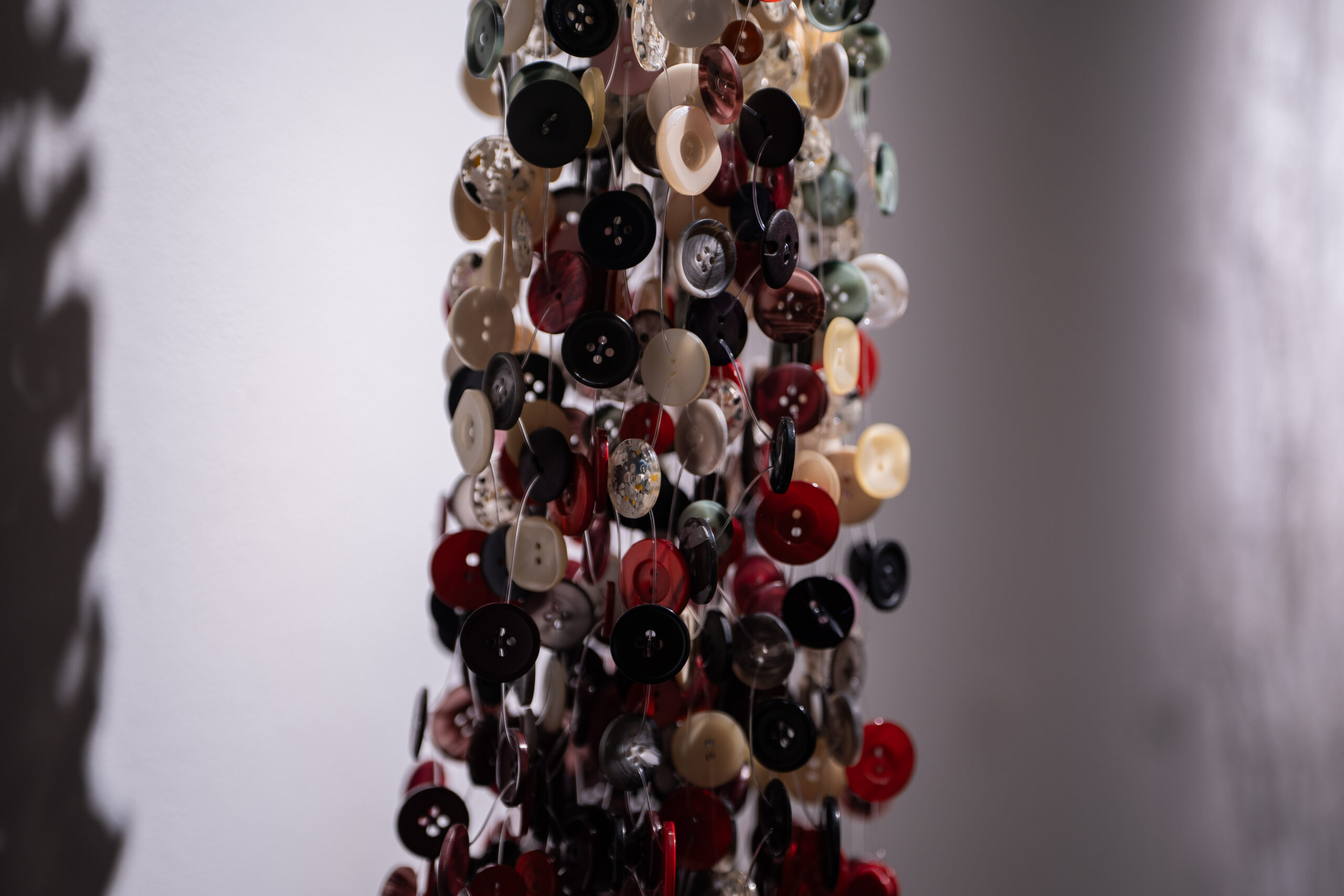 In the wake of his father’s passing, Bajus returned to that workshop and found himself surrounded by unfinished garments, zippers, buttons, threads, pins, needles, and fabric scraps—materials waiting for transformation. Unable to leave them behind in Slovakia, he brought many of these items back to his studio in Western New York, incorporating them into new works that honor his father’s artistry and legacy.