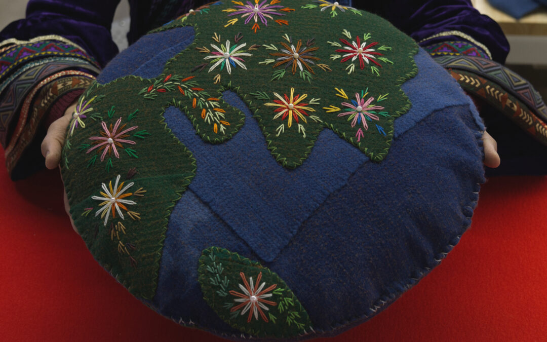 Reverence is an installation of large, hand-dyed feltloom fabrics suspended from the ceiling. Envisioned as the central ‘island’ of the exhibition, the colors of the fabric connect to and encourage respect for the environment: blue for water, gold for sunlight, and brown for the earth. Surrounding each fabric are hand-embroidered three-dimensional earths created by refugee women from all around the world, reflecting on the collective responsibility of sustainability.